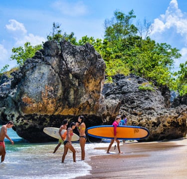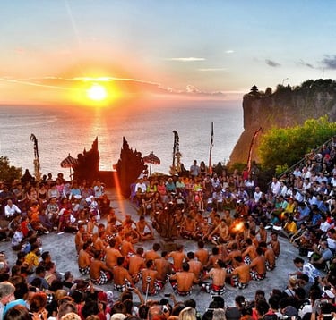 Pela manhã, vamos aproveitar a praia de Padang Padang, que ficou internacionalmente famosa pelas suas ondas tubulares e por sua beleza. Momento para relaxar, recuperar as energias e se deixar levar pela simplicidade da vida balinesa. No final da tarde, vale a pena curtir o pôr do sol de cima do cliff de Uluwatu, ou na praia, que pode ser acessada apenas na maré vazia.