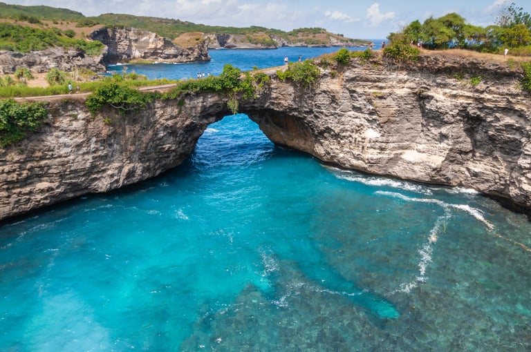 Depois, siga para a Broken Beach, que fica a alguns quilômetros da Kelingking Beach. Apesar de ser uma praia, não é recomendado nadar, pois as ondas entram na cratera com muita força, mas a vista é demais e vale a visita.
