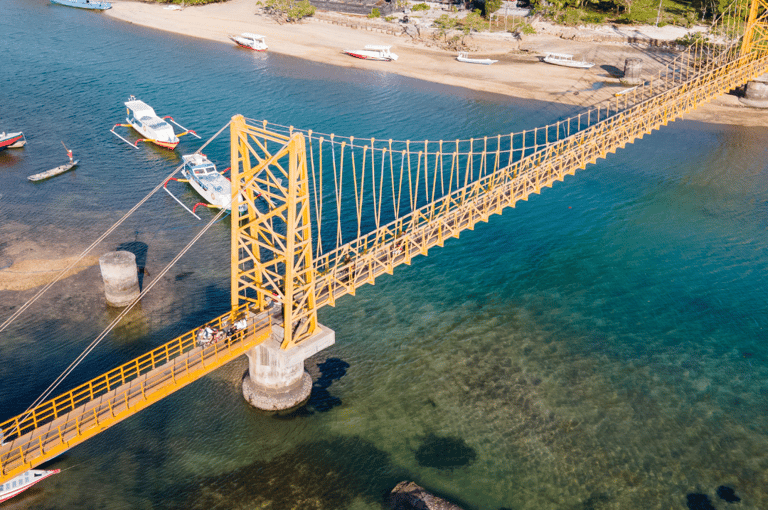 É possível chegar até Ceningan atravessando de motinho ou a pé por uma ponte amarela a partir de Nusa Lembongan.